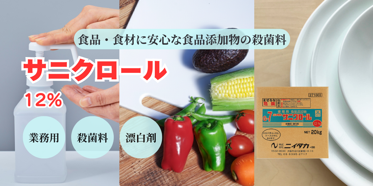 食品・食材に安心な食品添加物の殺菌料次亜塩素酸ナトリウムを含有する塩素系の殺菌料・漂白剤です。食品添加物ですので、漂白・殺菌・除菌にも安心してお使いいただけます。